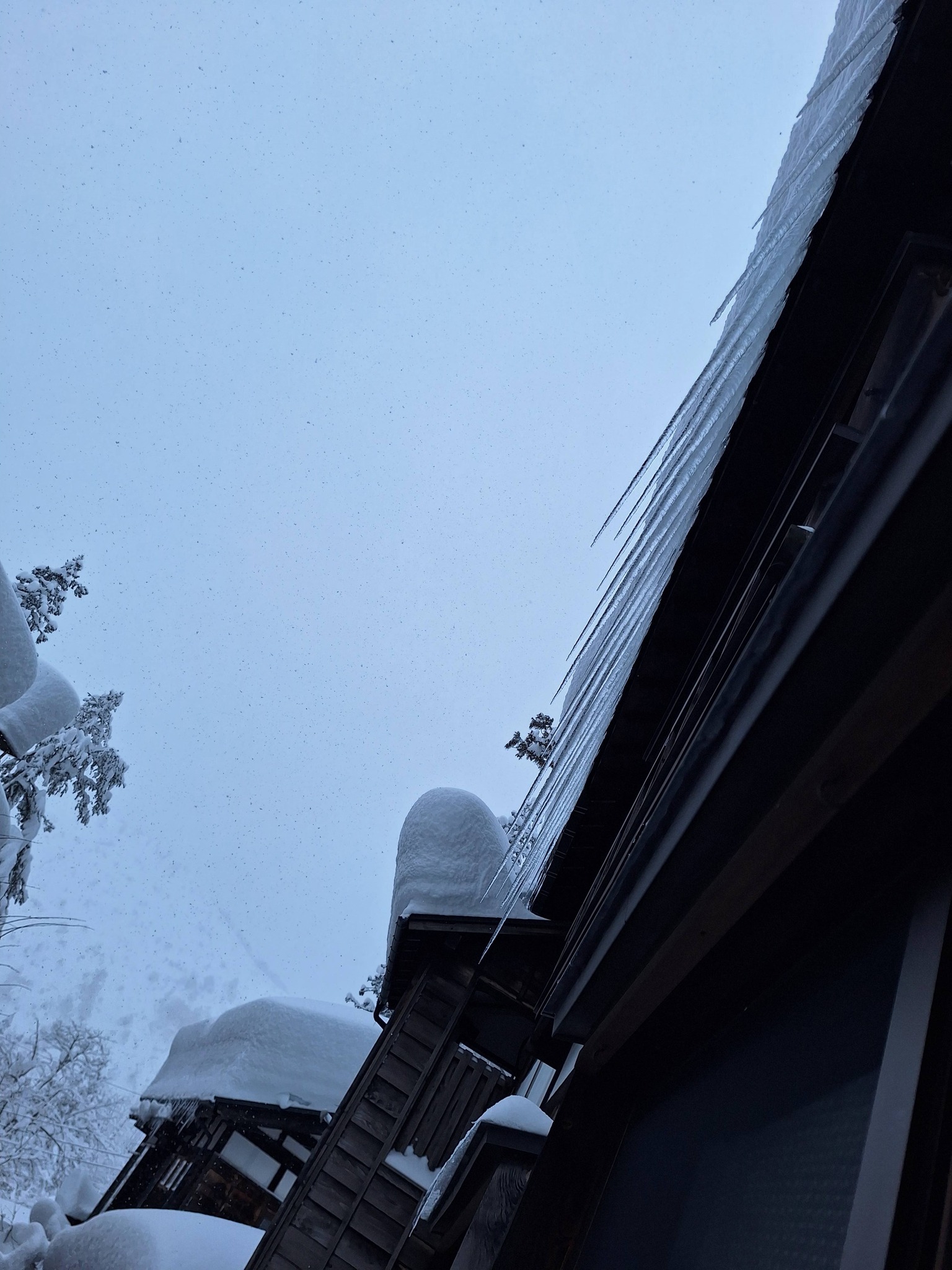 小屋根の雪庇がいまにも落ちそうだ。